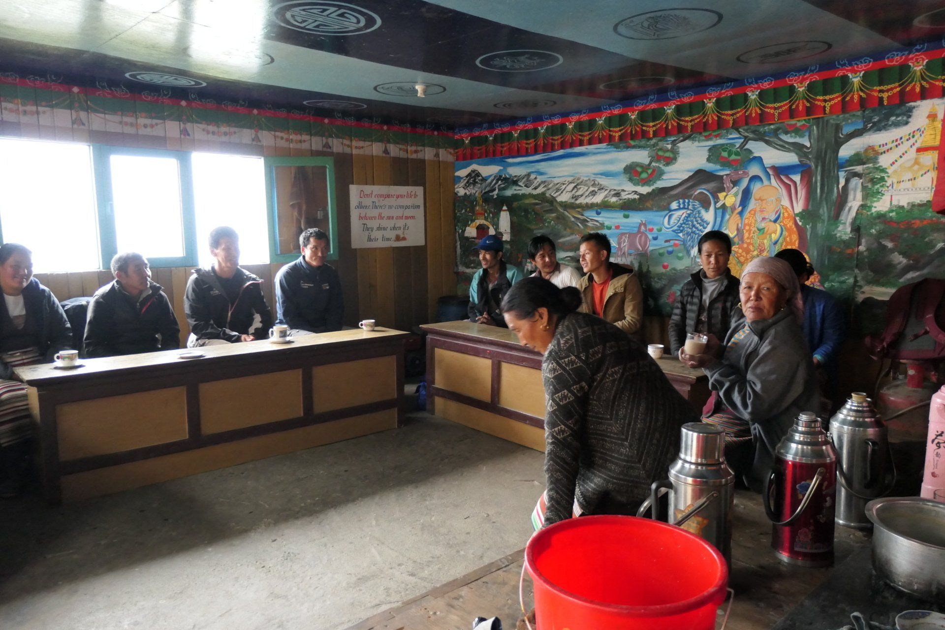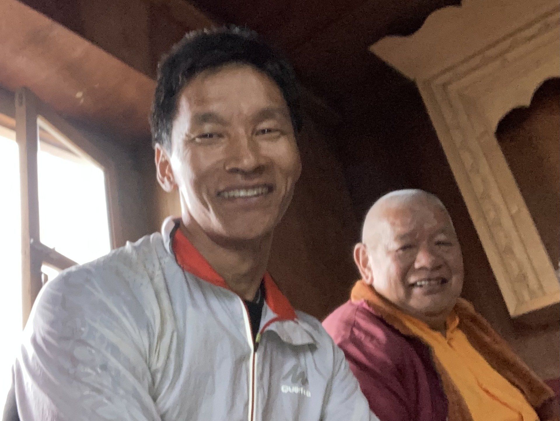 Depuis mon entrée dans ce lieu, j’ai croisé souvent ces personnes. Bien qu’il me soit très difficile d’échanger avec elles (je ne parle pas le népalais et encore moins la langue sherpa, tandis que de leur côté elles, ne parlent ni le français ni l’anglais). Pour autant, j’ai le sentiment que des mots s’échangent dans nos regards et que nous parvenons à partager silencieusement quelques pensées et même les émotions qui nous traversent en ce beau moment de rencontre. Elles sont souriantes et j’ai comme l’impression qu’elles sont heureuses non seulement de vivre et d’être là, dans cette structure collective qui leur permet de ne pas être isolées, mais aussi de notre présence. Il est vrai que Dawa est considéré comme un Dieu. Elles savent toutes combien son investissement sans compter leur permet de vieillir sereinement et de s’acheminer paisiblement vers la mort ensemble. La mort ne leur fait pas peur. Elles puisent leur quiétude dans La philosophie bouddhiste qui les a préparées à la réincarnation.